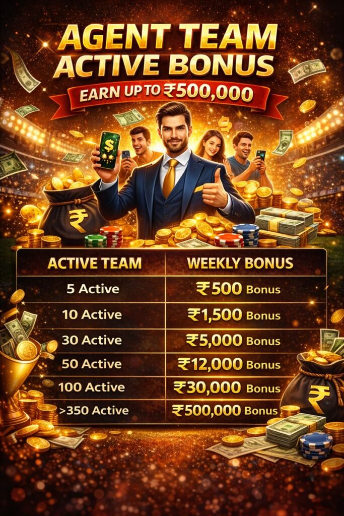 These visuals show a referral / team-bonus concept — you bring in people, they stay active, and you earn rewards (money or bonus). In many gaming and agent earning programs, an Agent Team Active Bonus rewards you for having a group of active players on your team. The more active members you have, the bigger the bonus you can earn.